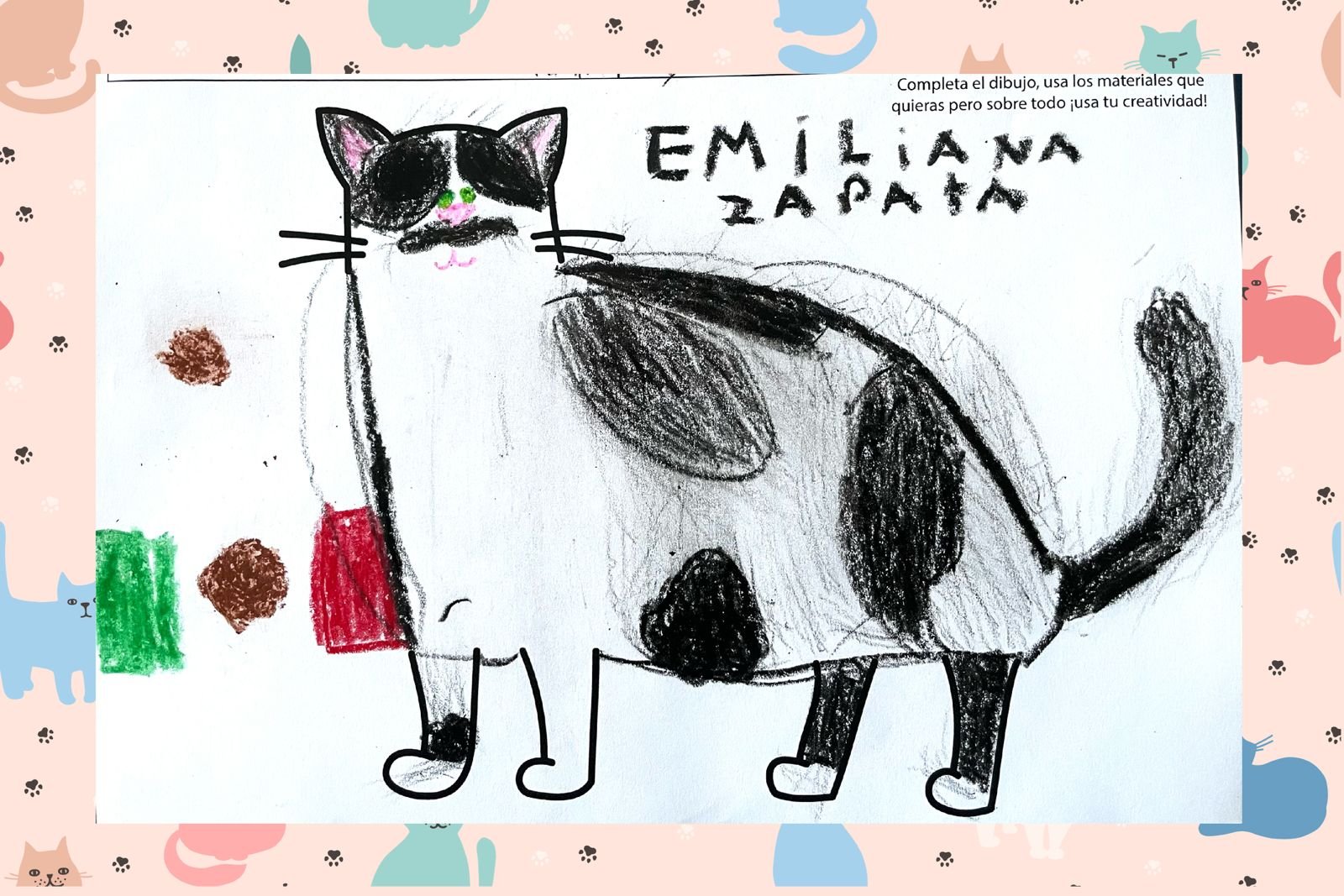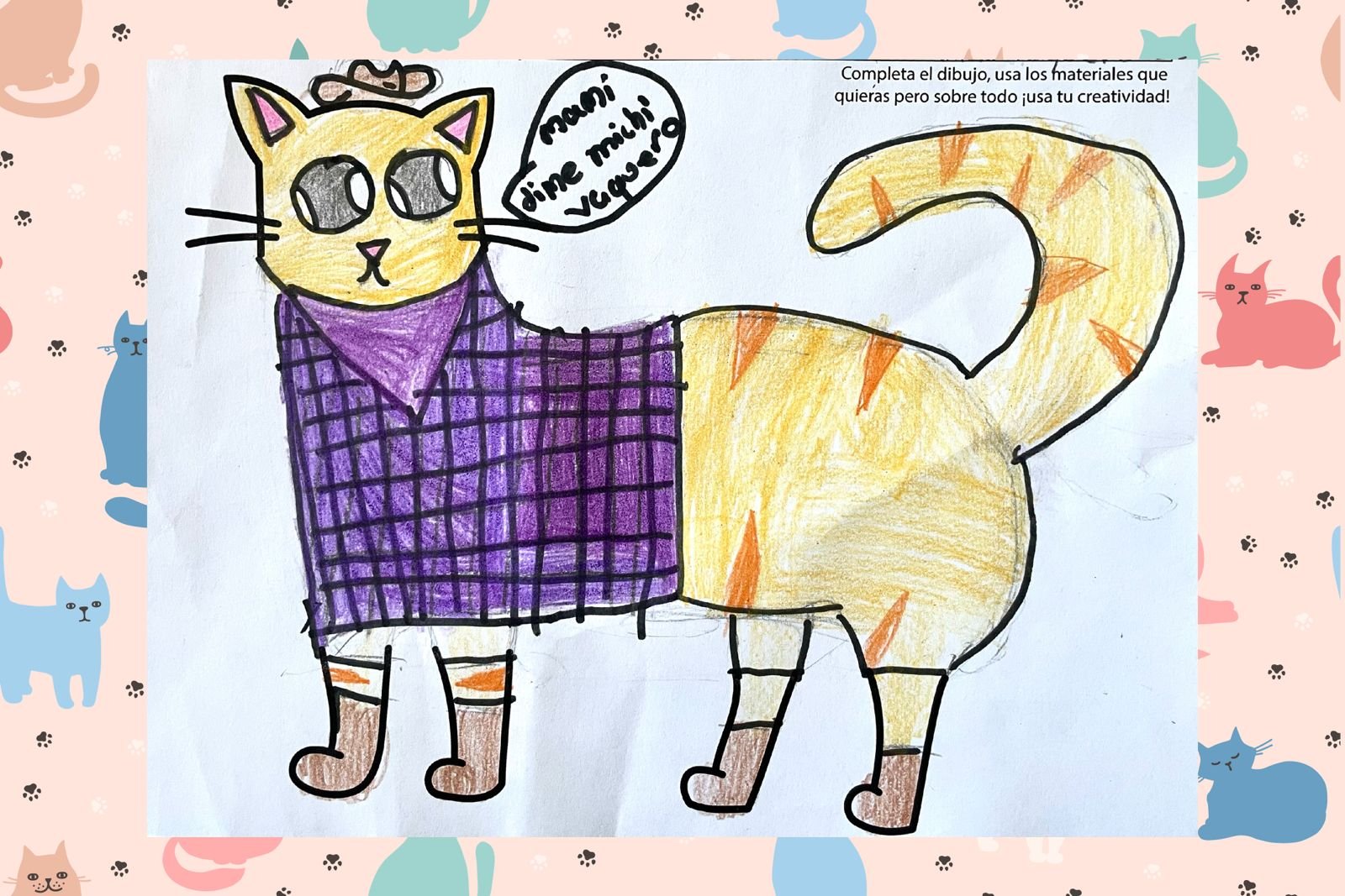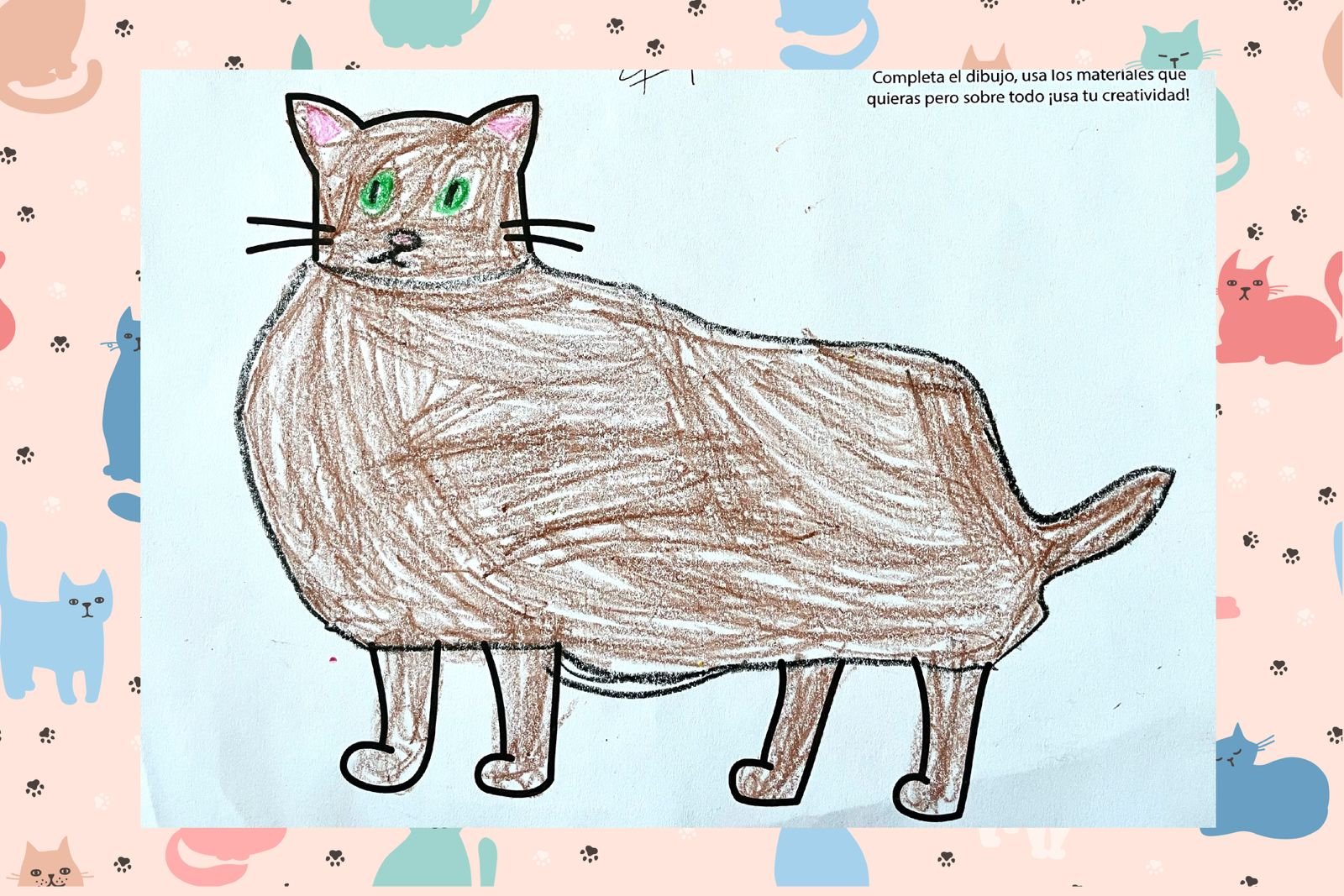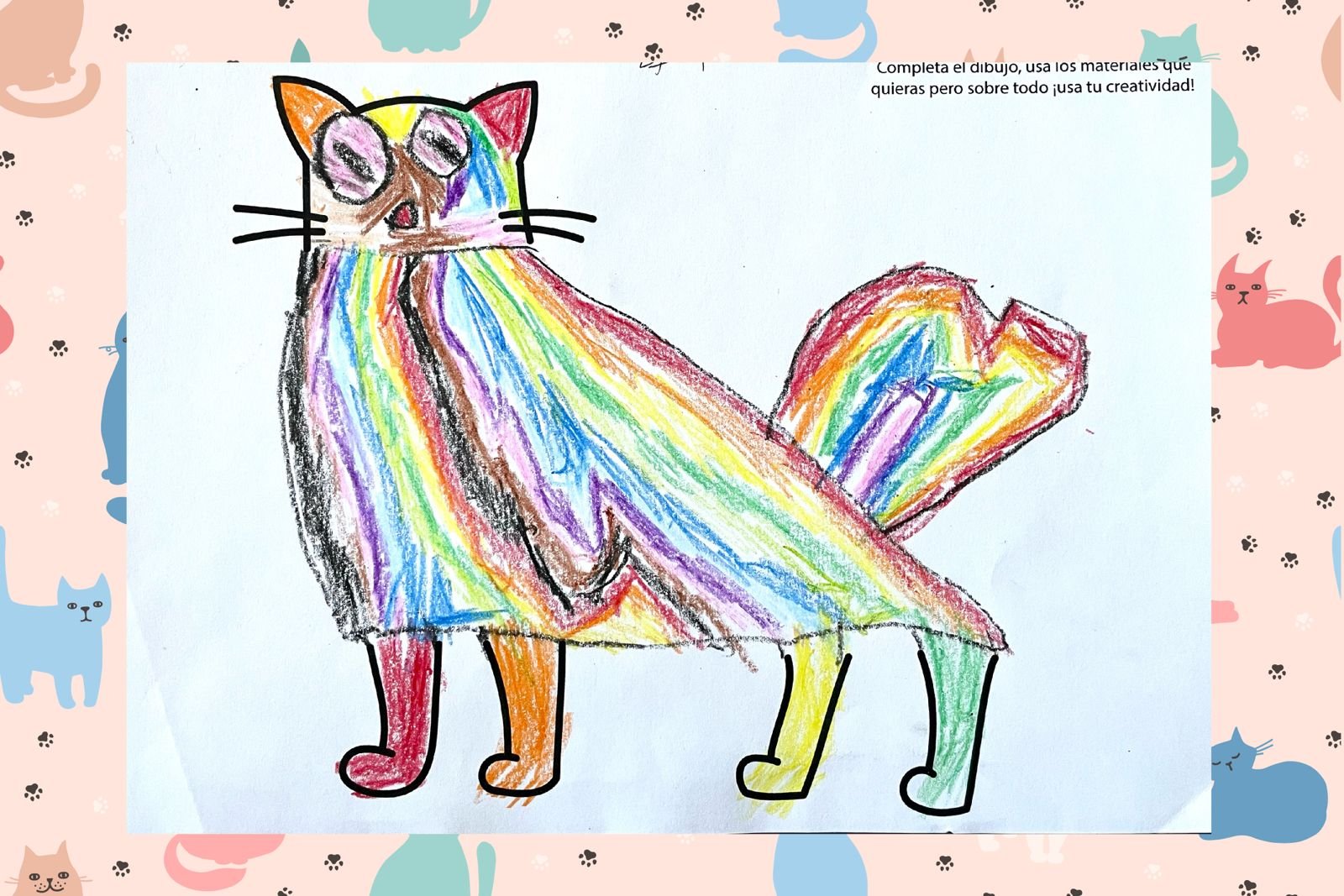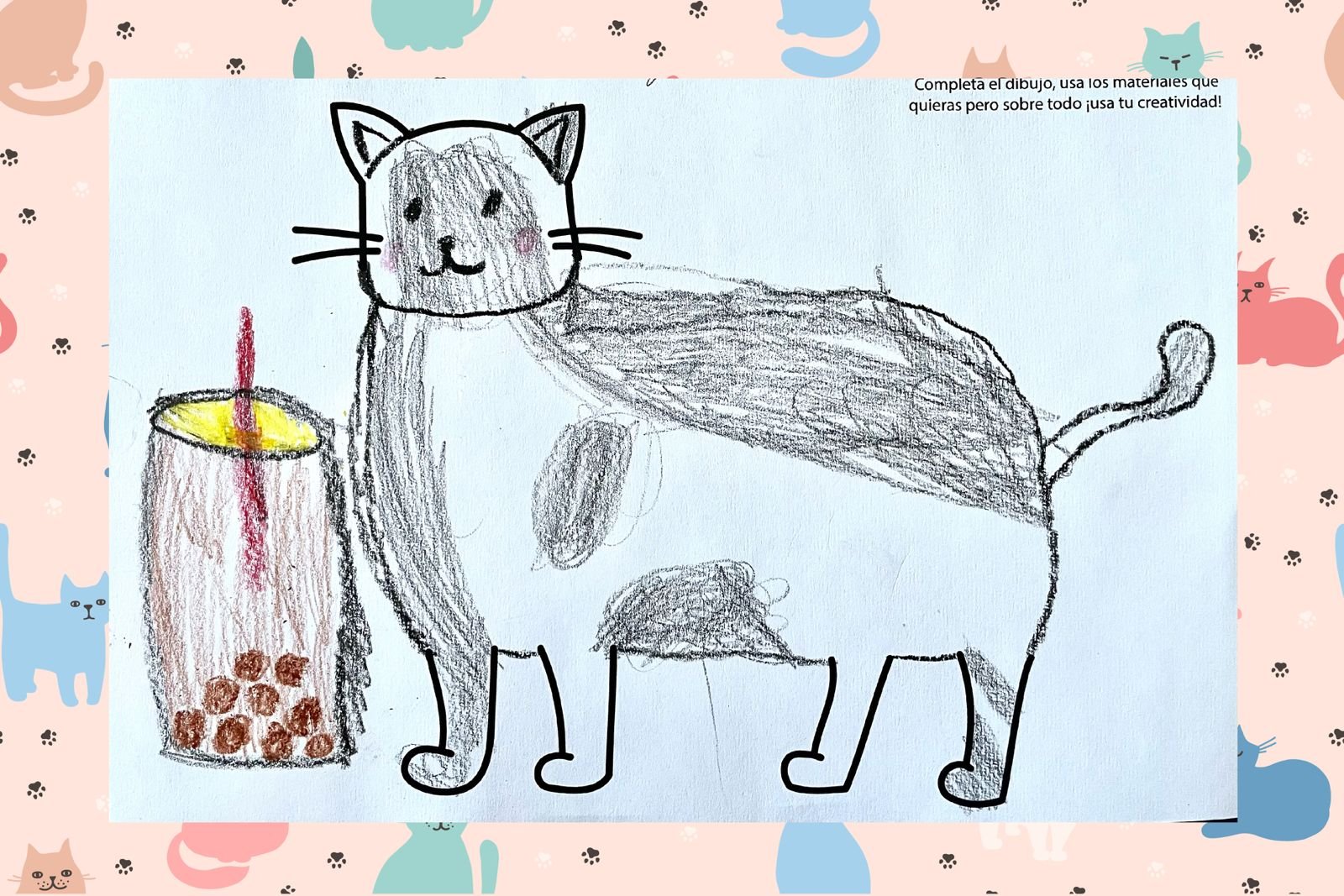 Lucia dibujó a su gato favorito del café con mucho cariño y colores vibrantes. ¡Nos encantó su energía!
