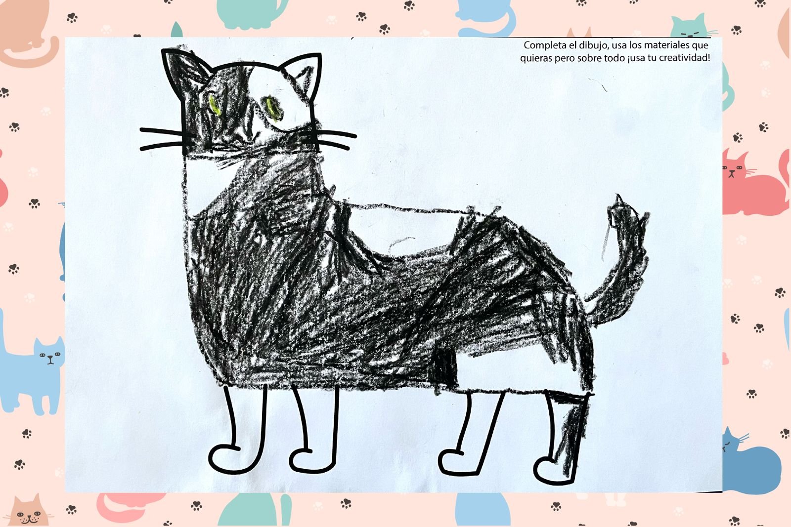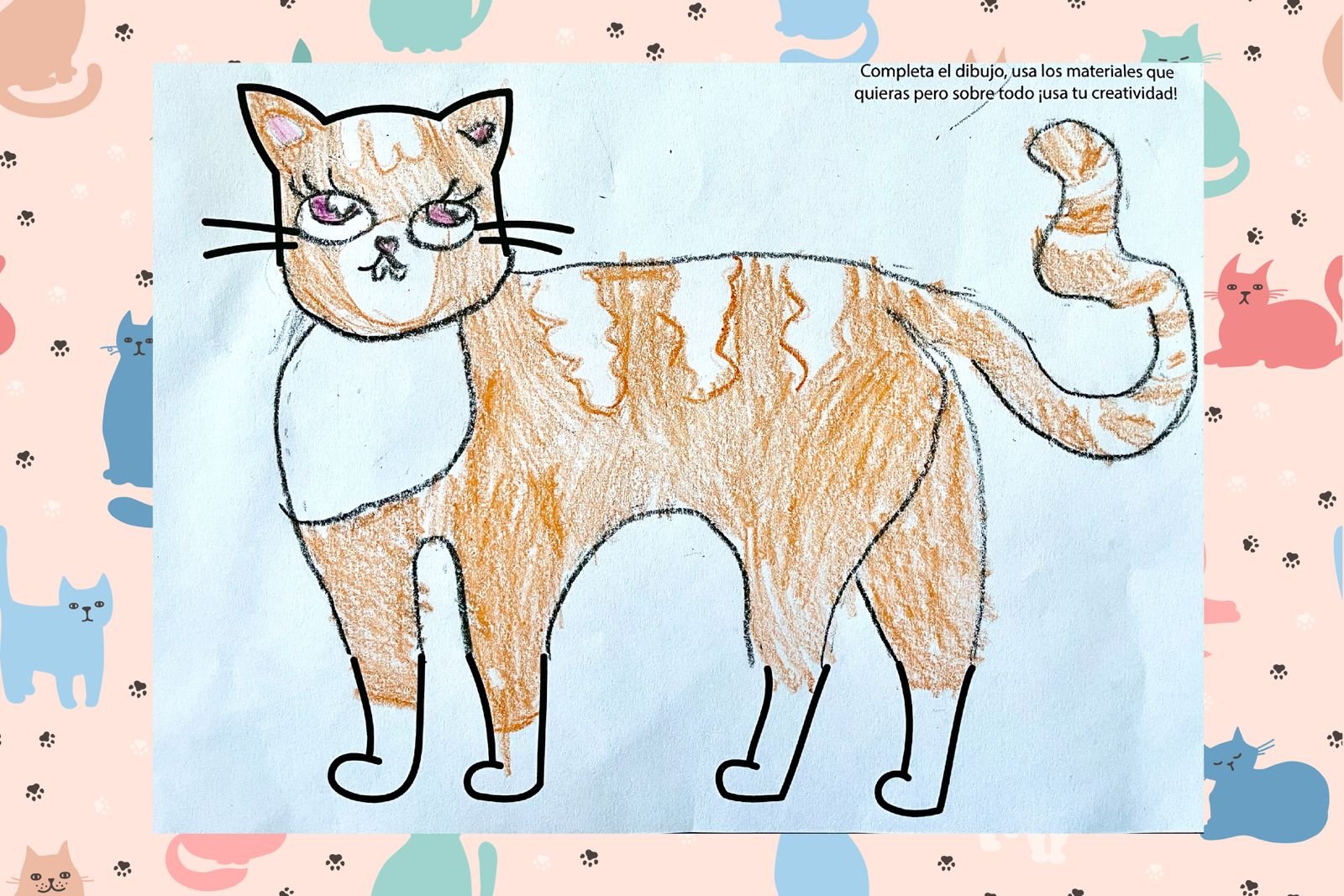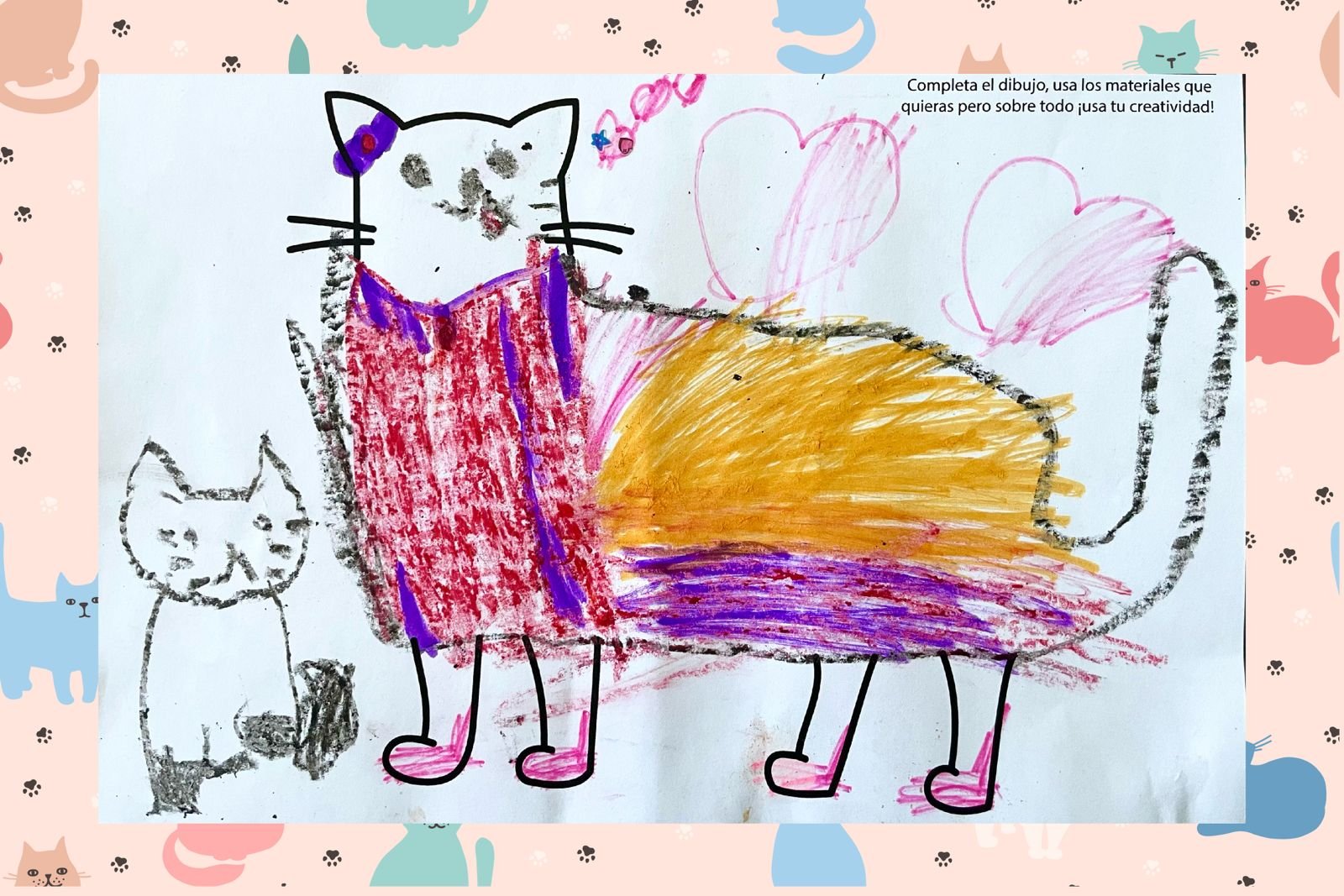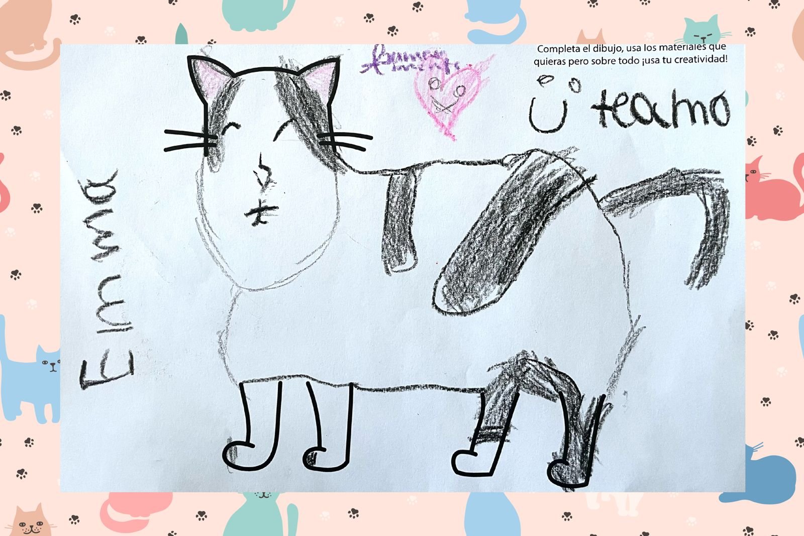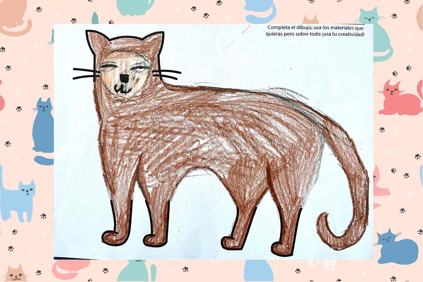 Lucia dibujó a su gato favorito del café con mucho cariño y colores vibrantes. ¡Nos encantó su energía!